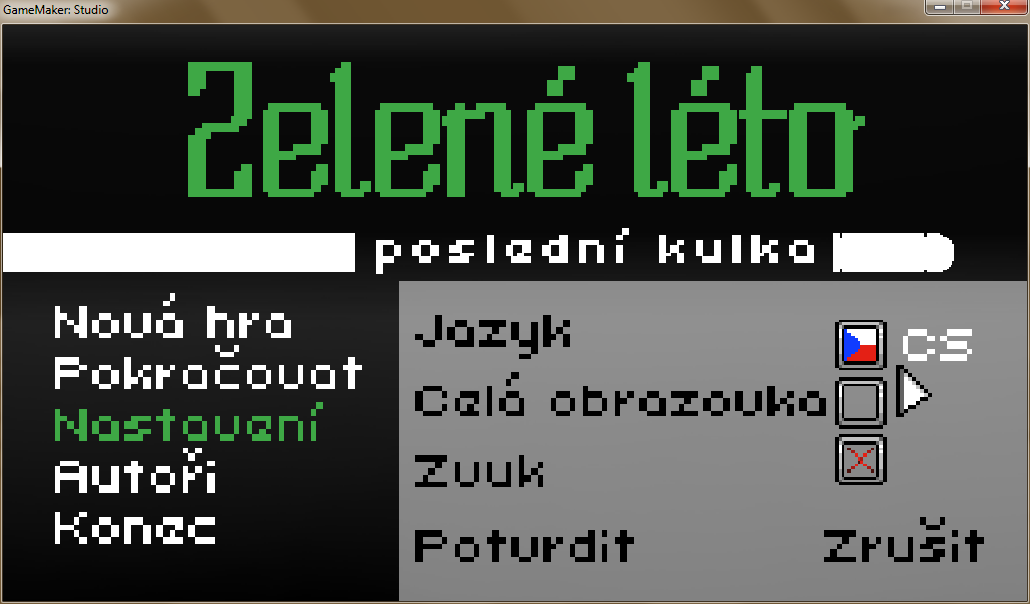 Další věc co jsem dotáhl do konce, je systém ukládání nastavení hry. Není tam toho moc, ale i tak si myslím že je lepší nastavit to jen jednou. Při prvním spuštění hry se objeví obrazovka s výběrem jazyka, a vaší volbu si hra zapamatuje a při dalším spuštění se ptát už nebude. Pokud se rozmyslíte, je tu samozřejmě klasické nastavení.